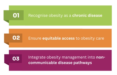 Recognise obesity as a chronic disease within health systems and establish funding structures to improve equitable access to all evidence-based obesity treatments, long-term management, counselling, and peer support services.