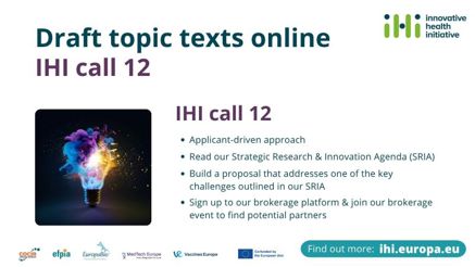draft text of IHI Call 12 is now available, giving applicants extra time to prepare a strong proposal and join or build a winning consortium.
