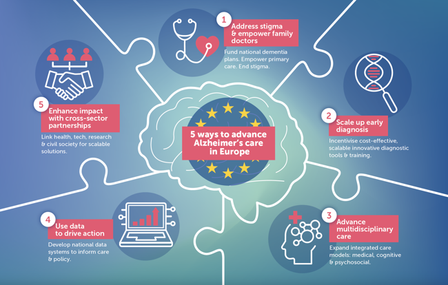 Drawing on insights from experts and advocates, the report sets out five priority actions which can accelerate progress in how Europe’s cares of people with Alzheimer’s disease: